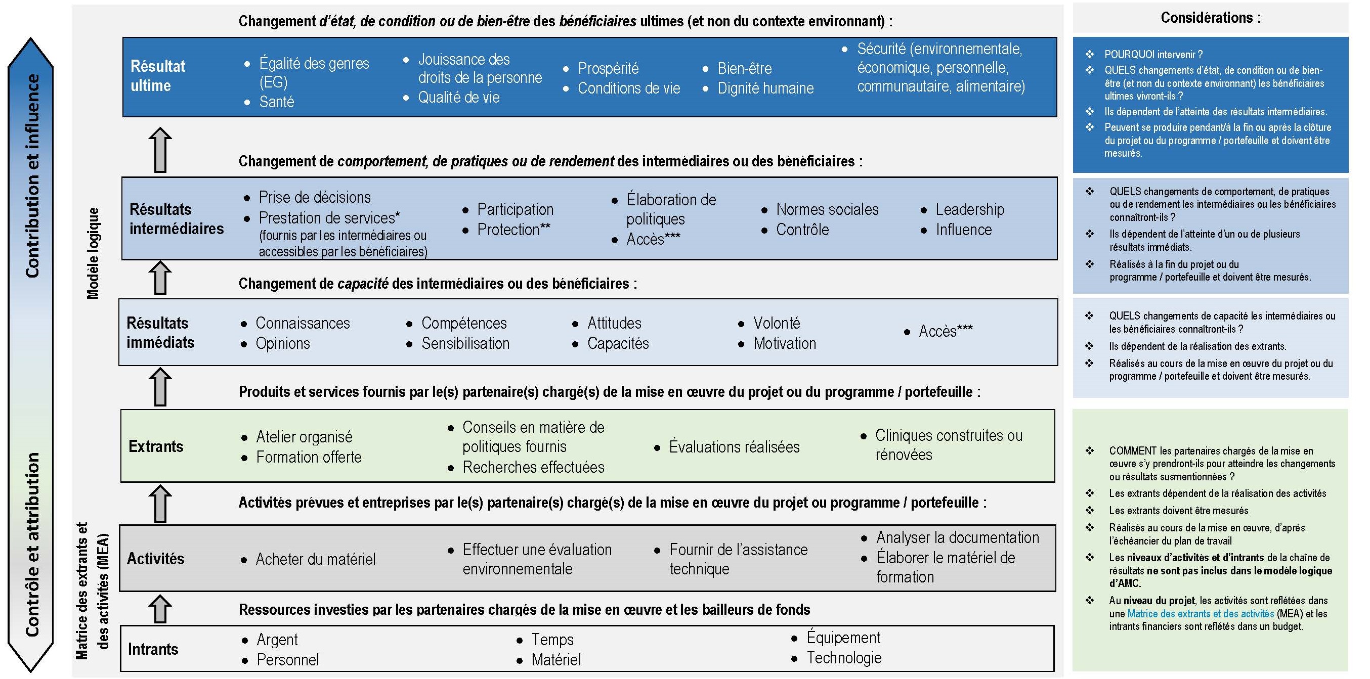 - Réalisés au cours de la mise en œuvre, d’après l’échéancier du plan de travail. Les niveaux d’activités et d’intrants de la chaine de résultats ne sont pas inclus dans le modèle logique d’AMC.