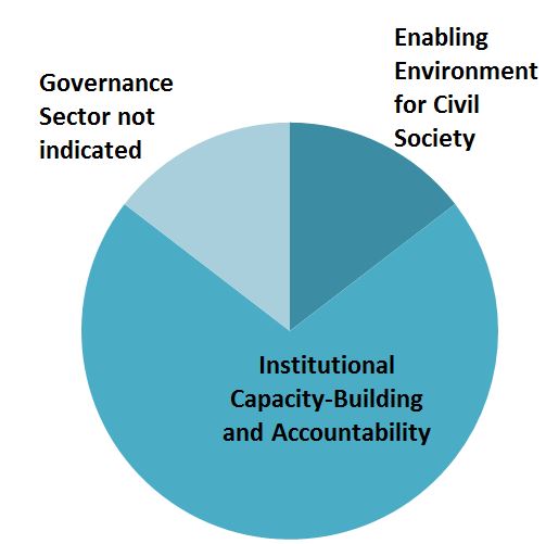 A pie chart indicates governance programming in Vietnam. The largest piece of the pie is indicated in green for Institutional Capacity-building and Accountability. The remaining two pieces of the pie are of equal amounts and represent Governance Sector not indicated, and Enabling Environment for Civil Society.